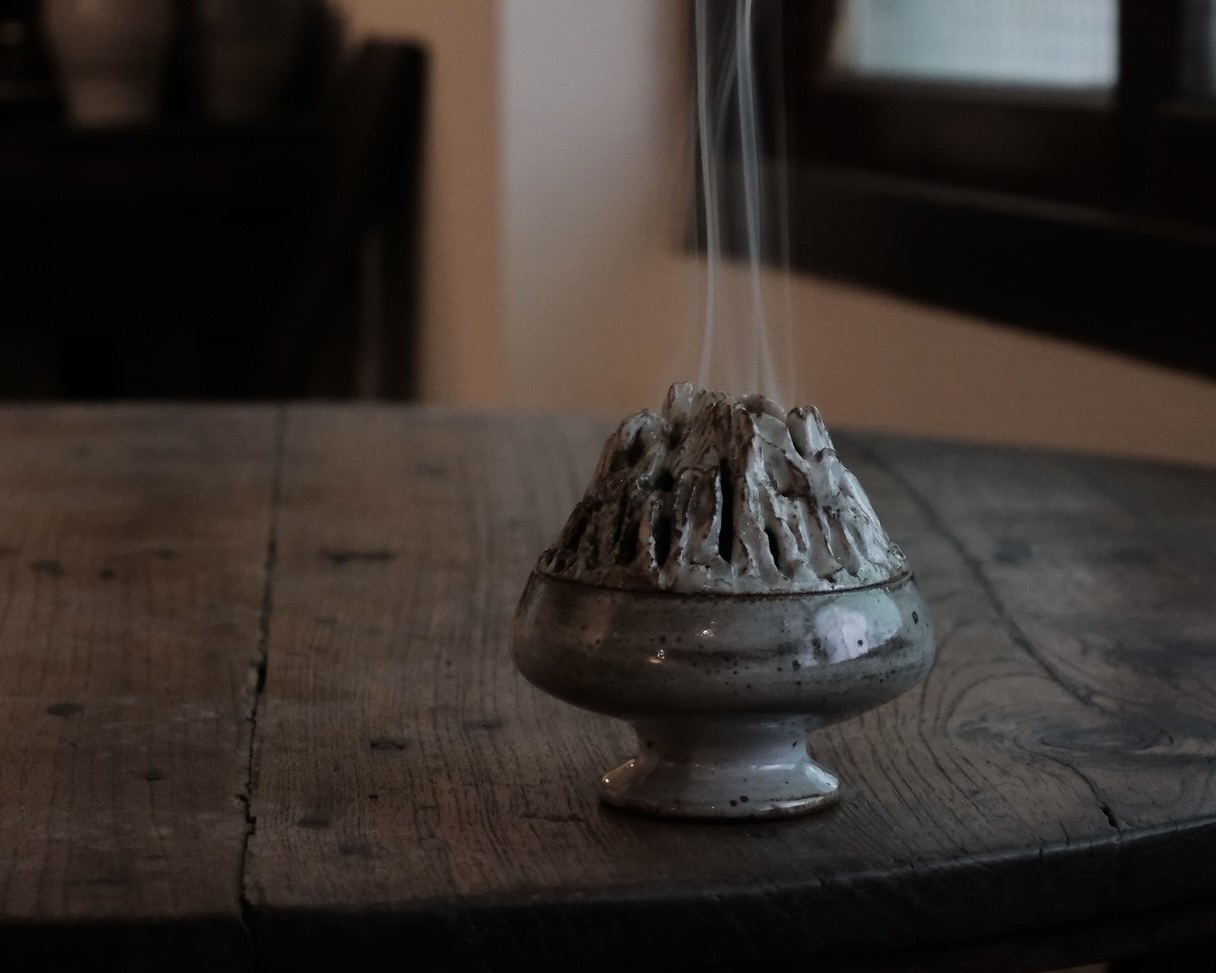 博山爐在此不僅是一種造型語彙,而承載著山、境界與內在秩序的象徵意義。爐身的山稜起伏,暗示由外而內、由凡入靜的行進路徑;孔洞與內部煙道的配置,象徵氣的運行與心緒的轉化。煙在山中行走、盤旋、逸散,如同意識在層層界域中被引導,結界隨之自然生成。